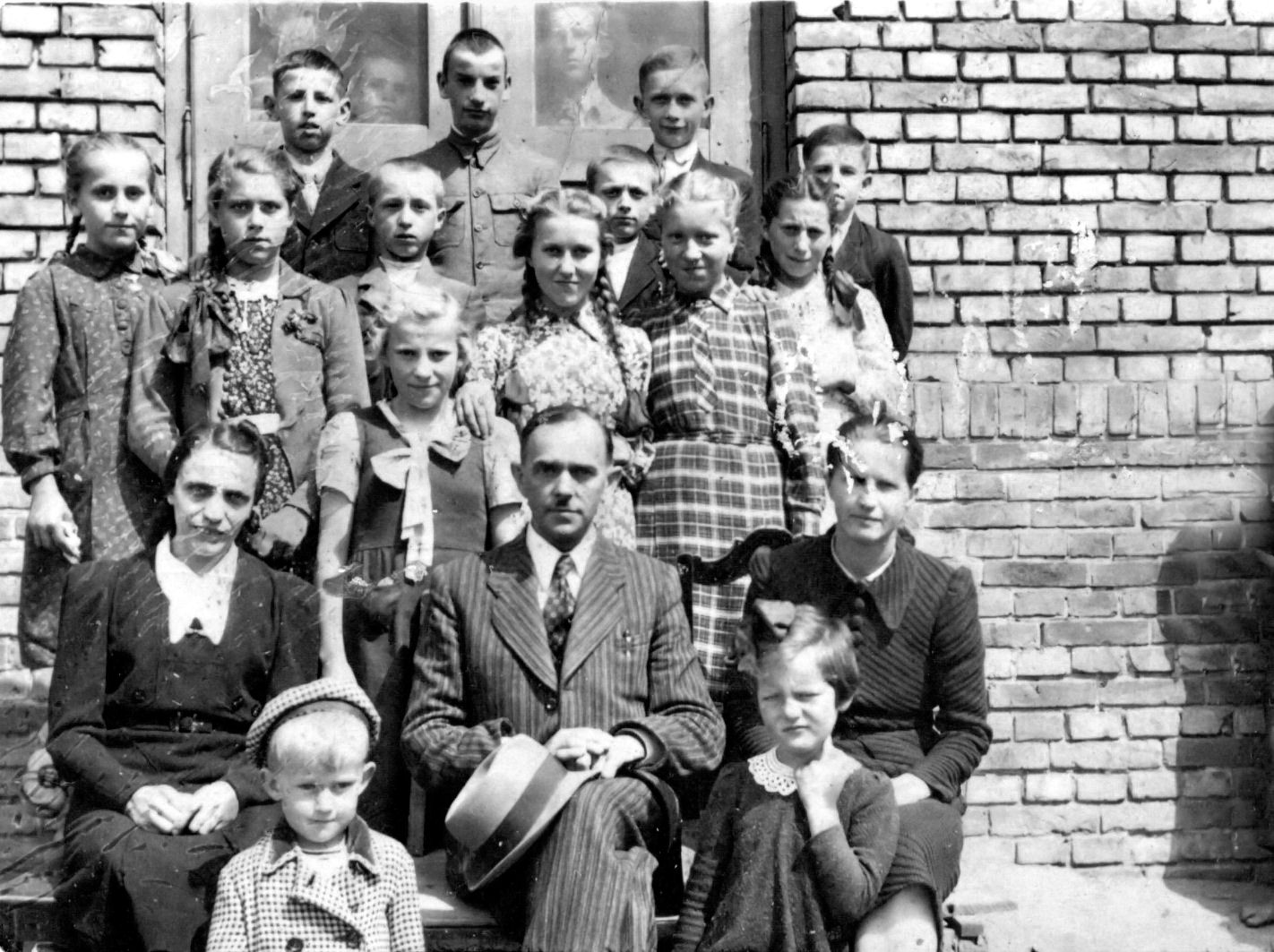 1942 r. Klasa VII z nauczycielami: p. Lasocińska, Leon Kusiński, Aniela Kańska