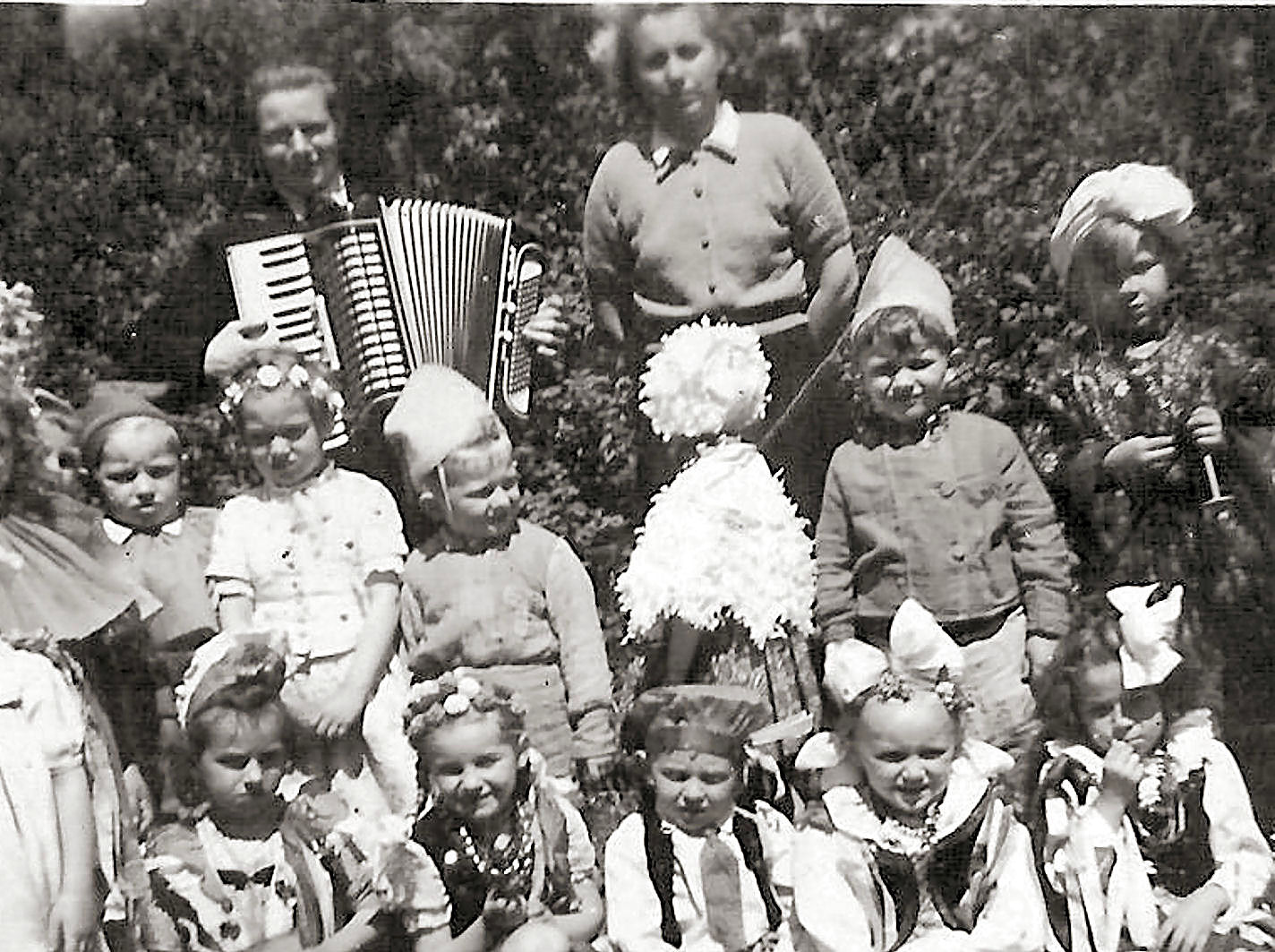 1953 r. Fotografia wykonana po szkolnej uroczystości. Z harmonią – p. Czesław Kusiński.