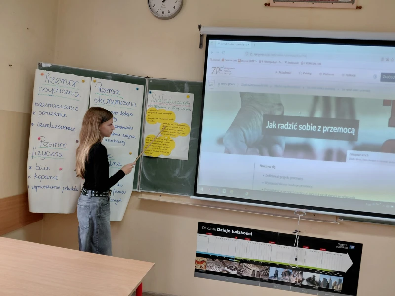 W tych klasach uczniowie podczas zajęć z psychologiem szkolnym pogłębiali wiedzę o formach przemocy (fizycznej, słownej, psychicznej i cyberprzemocy), dokonywali autorefleksji, rozwiązywali przykładowe sytuacje problemowe i ćwiczyli bezpieczne sposoby reagowania — zarówno jako osoba poszkodowana, jak i świadek.