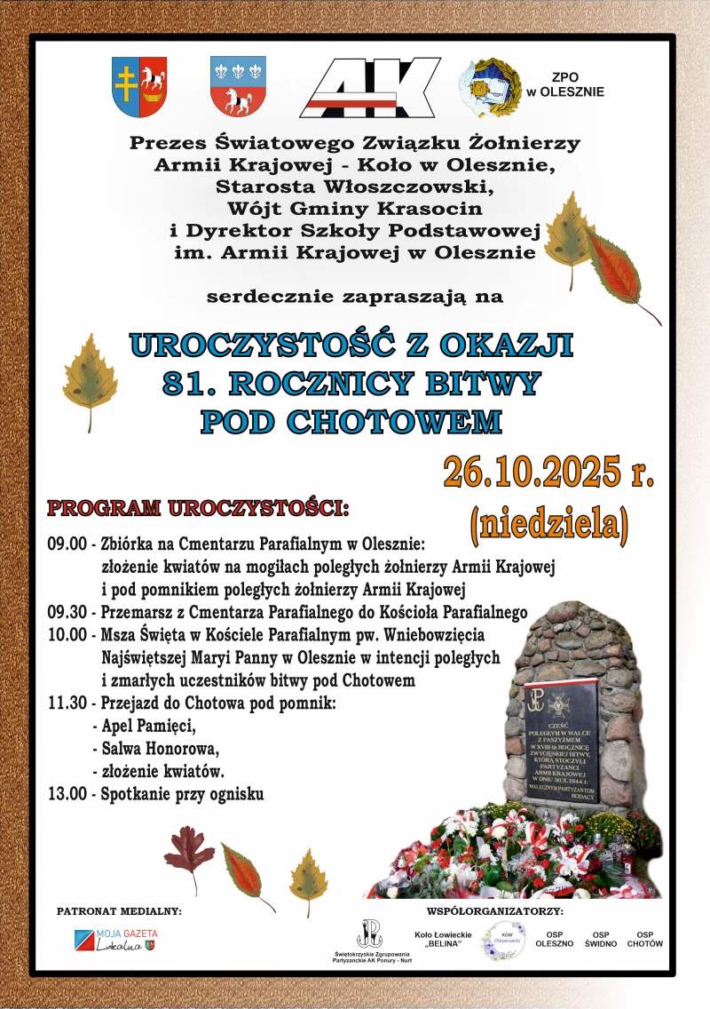 10:00 Msza święta w Kościele Parafialnym pw. Wniebowzięcia Najświętszej Maryi Panny w Olesznie w intencji poległych i zmarłych uczestników bitwy pod Chotowem