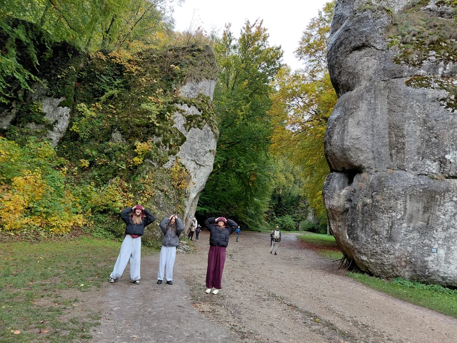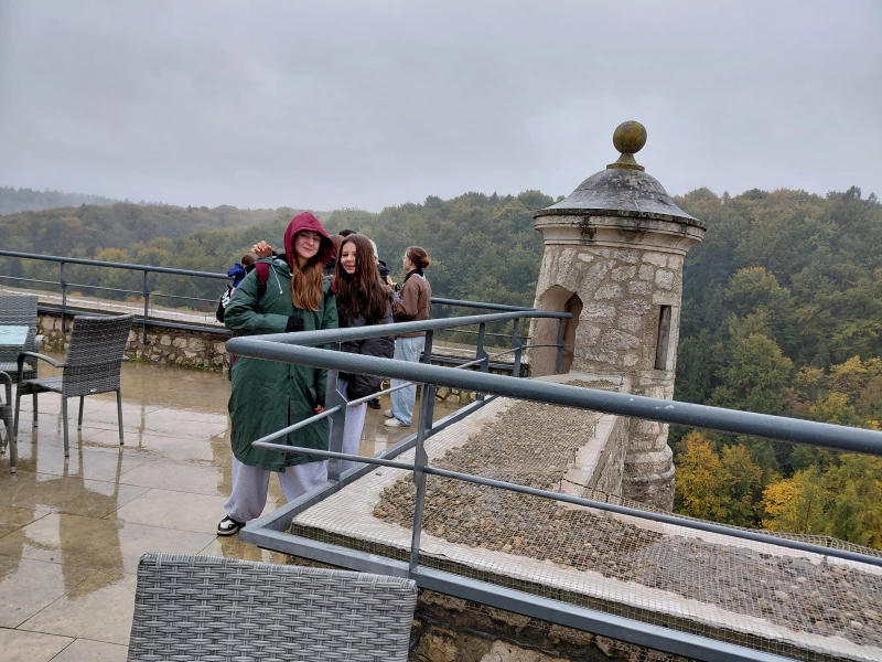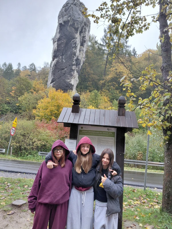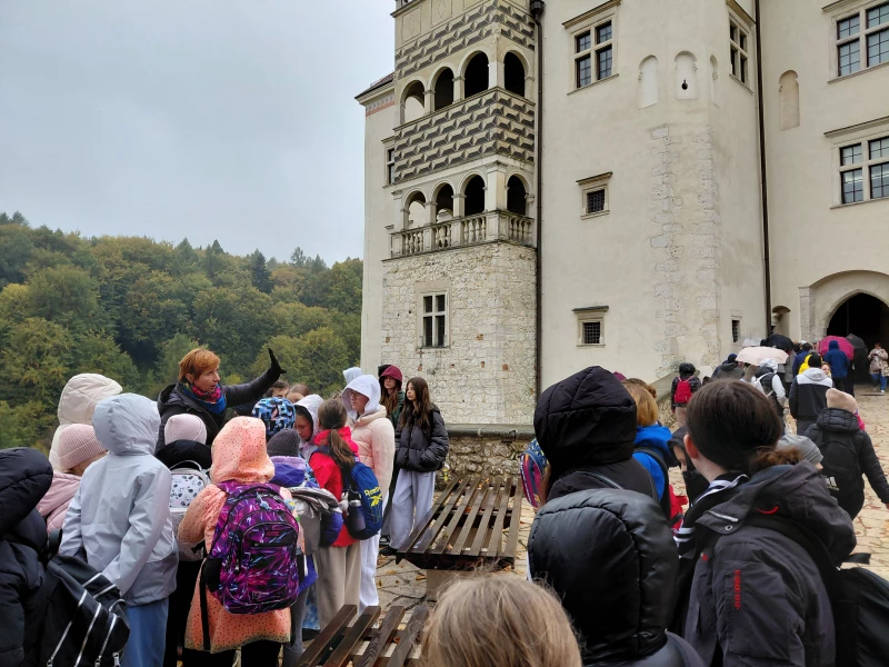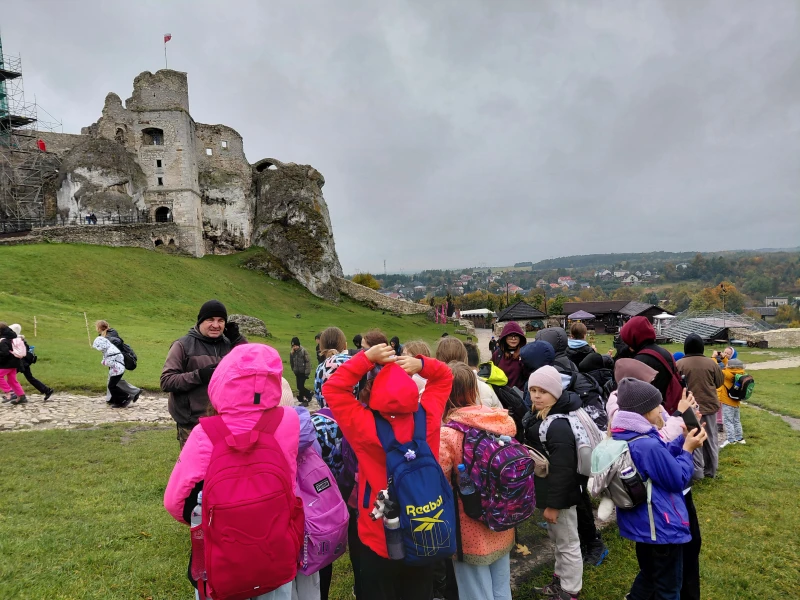 To już niedziela rano! – pobudka. Wspólne pożegnalne śniadanie, sprzątanie miejsca zakwaterowania. A potem przejazd do zamku w Ogrodzieńcu – największej i najbardziej znanej ruiny zamku na Szlaku Orlich Gniazd, położonej w miejscowości Podzamcze. Żeby wejść na zamek w Ogrodzieńcu musieliśmy „wdrapać się” na niewielkie wzgórze. Po drodze na zamek mijaliśmy malowniczą grupę skał, które turyści nazwali wielbłądem lub Sfinksem. Dalej idąc po zwodzonym moście i po przejściu przez wielką bramę doszliśmy na zamkowy dziedziniec. Podczas zwiedzania zamku przewodnik zwrócił nam uwagę na to, że jego mury genialnie wkomponowane są w skały. Przez to zamek wygląda jakby był jednością z całym wzgórzem i wyrastał wprost ze skały. Nic dziwnego, że upodobali go sobie filmowcy. Na przestrzeni lat zagrał w filmach “Janosik”, “Zemsta”, a nawet w ostatnim czasie w serialu Netflixa “Wiedźmin”. Zwiedzając ruiny tego zamku mogliśmy przenieść się w czasie, poznając niezwykłe wydarzenia i fakty związane z tą budowlą. Po obiedzie, wróciliśmy do domu - do Oleszna.