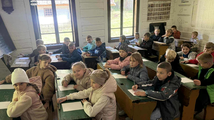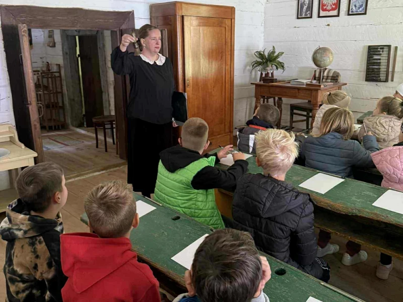 Na początku obejrzeliśmy stare chaty. Dowiedzieliśmy się, z czego budowano domy i jak urządzano ich wnętrza. Mogliśmy zobaczyć stare sprzęty kuchenne, meble i narzędzia, których używali nasi pradziadkowie. Następnie udaliśmy się na warsztaty pt. Lekcja w dawniej szkole. Dzieci weszły do starej drewnianej szkoły, w której kiedyś uczyły się ich rówieśnicy. W środku zobaczyliśmy drewniane ławki, kałamarze z atramentem i specjalne pióra do pisania. Zajęcia prowadziła pani nauczycielka ubrana w strój z dawnych czasów. Pokazała nam, jak wyglądała nauka wielu lat temu. Odbyła się lekcja matematyki, języka polskiego oraz zabawy z wykorzystaniem dawnych przedmiotów codziennego użytku jak pogrzebacz i fajerki. Dowiedzieliśmy się też, że dawniej dzieci często dostawały surowe kary za nieposłuszeństwo, np. klęczenie na grochu.